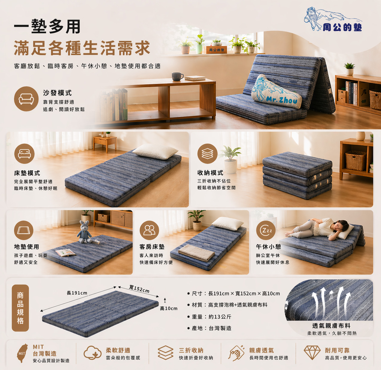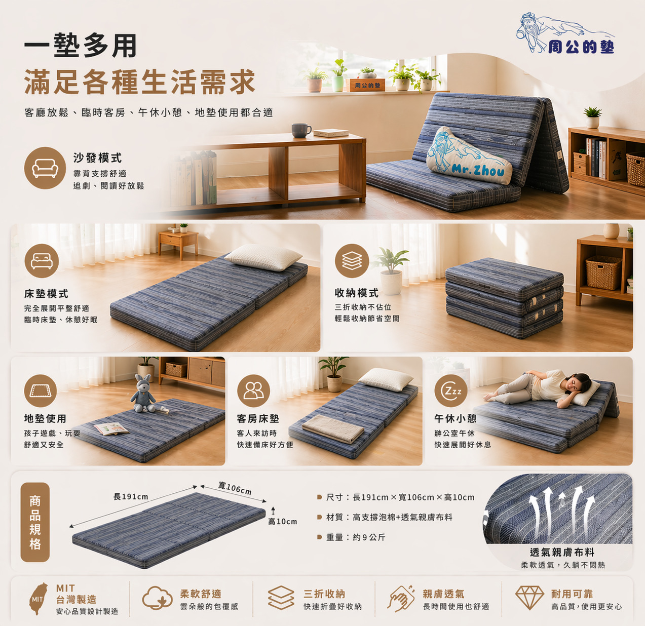 展開即可作為床墊或地墊使用,適合居家休息、客房臨時床墊或午休使用。不使用時可折疊收納,方便整理空間。