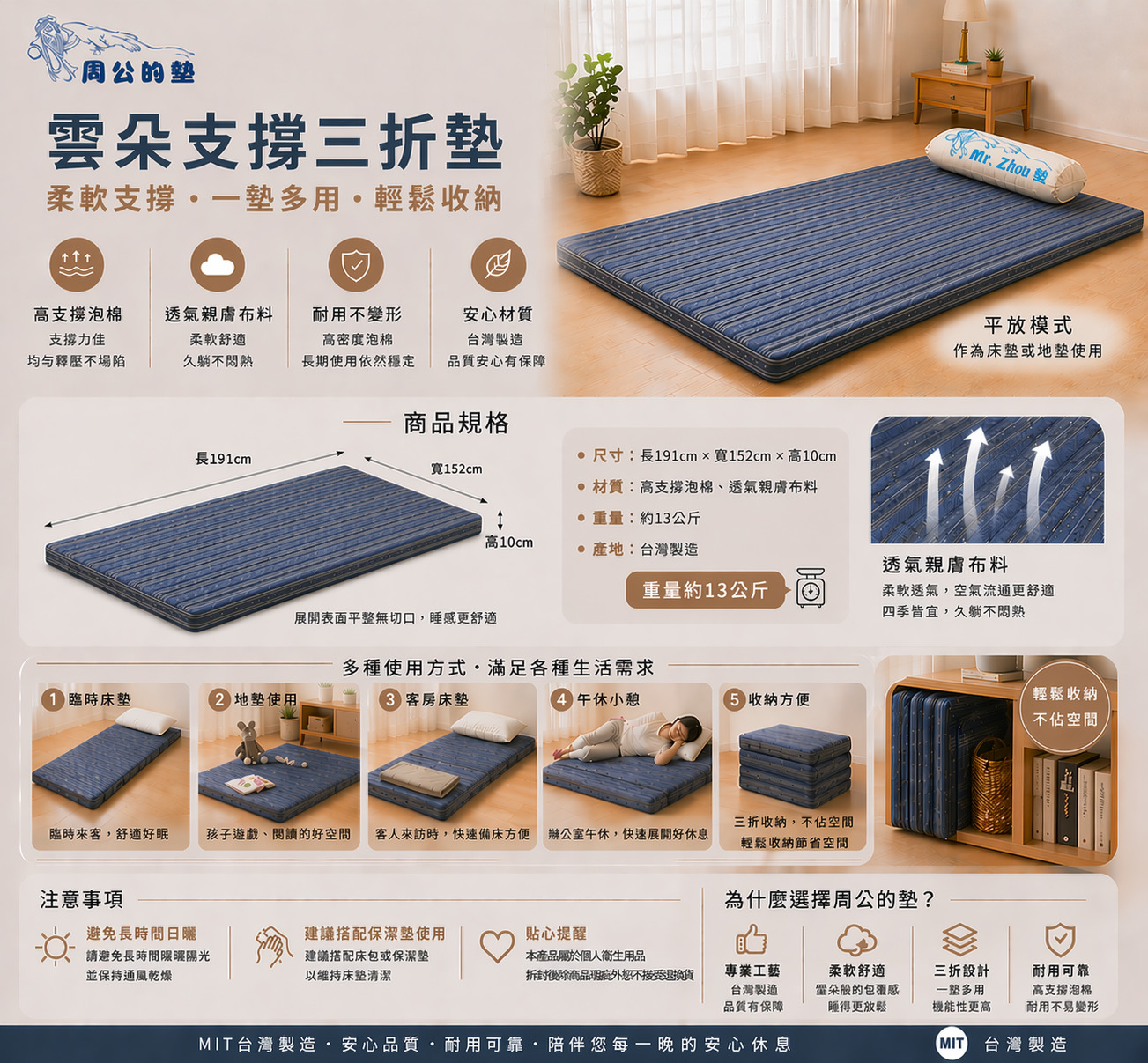 三折收納設計:可輕鬆折疊收納,節省空間,方便移動與收納。