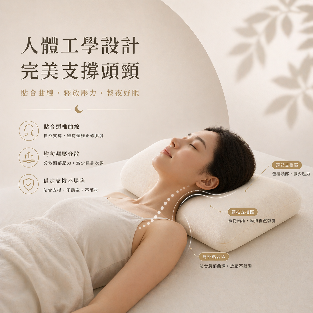 依人體曲線設計,支撐頭頸與肩頸,提升睡眠舒適度。