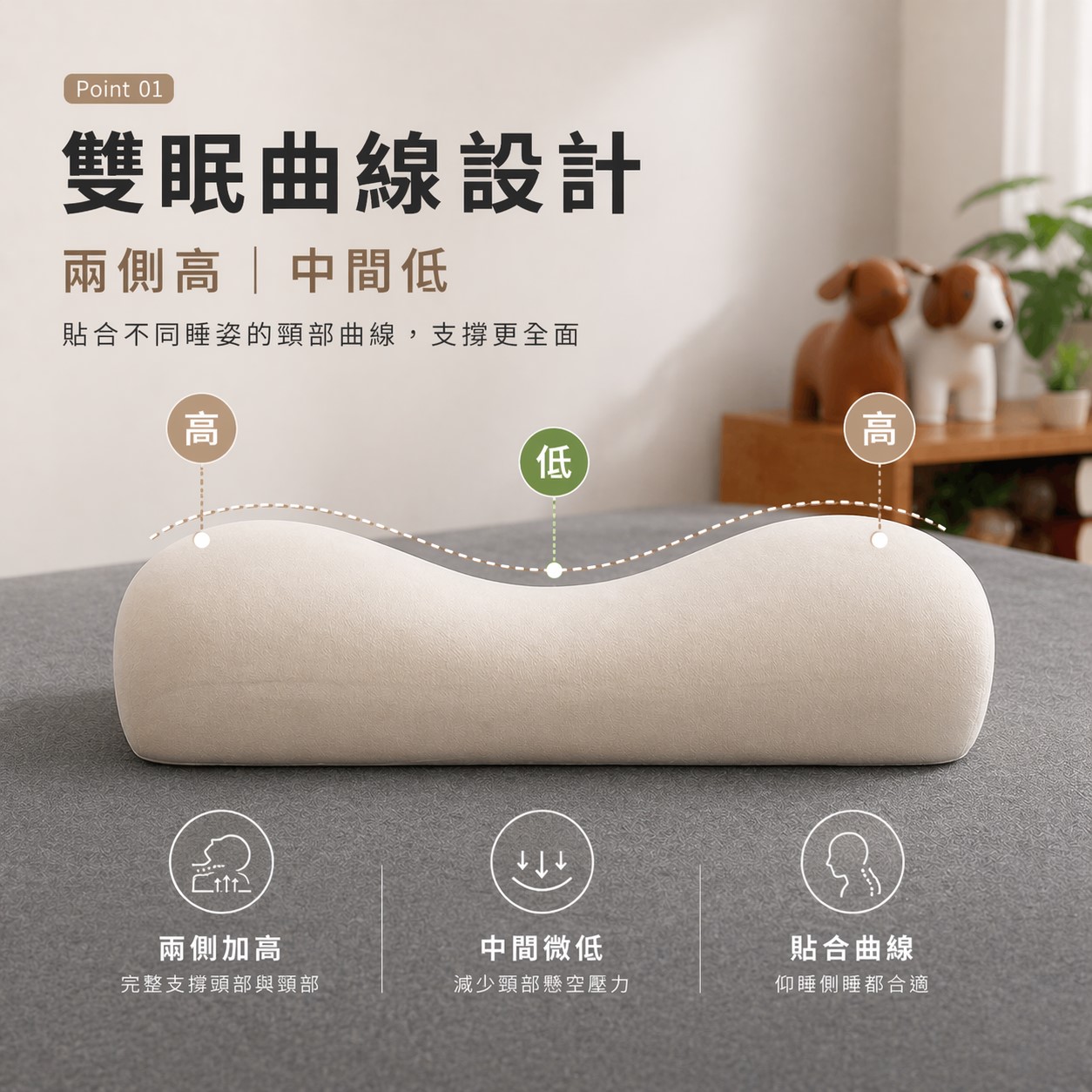 兩側較高、中間微低,貼合仰睡與側睡需求,翻身時依然維持良好支撐。