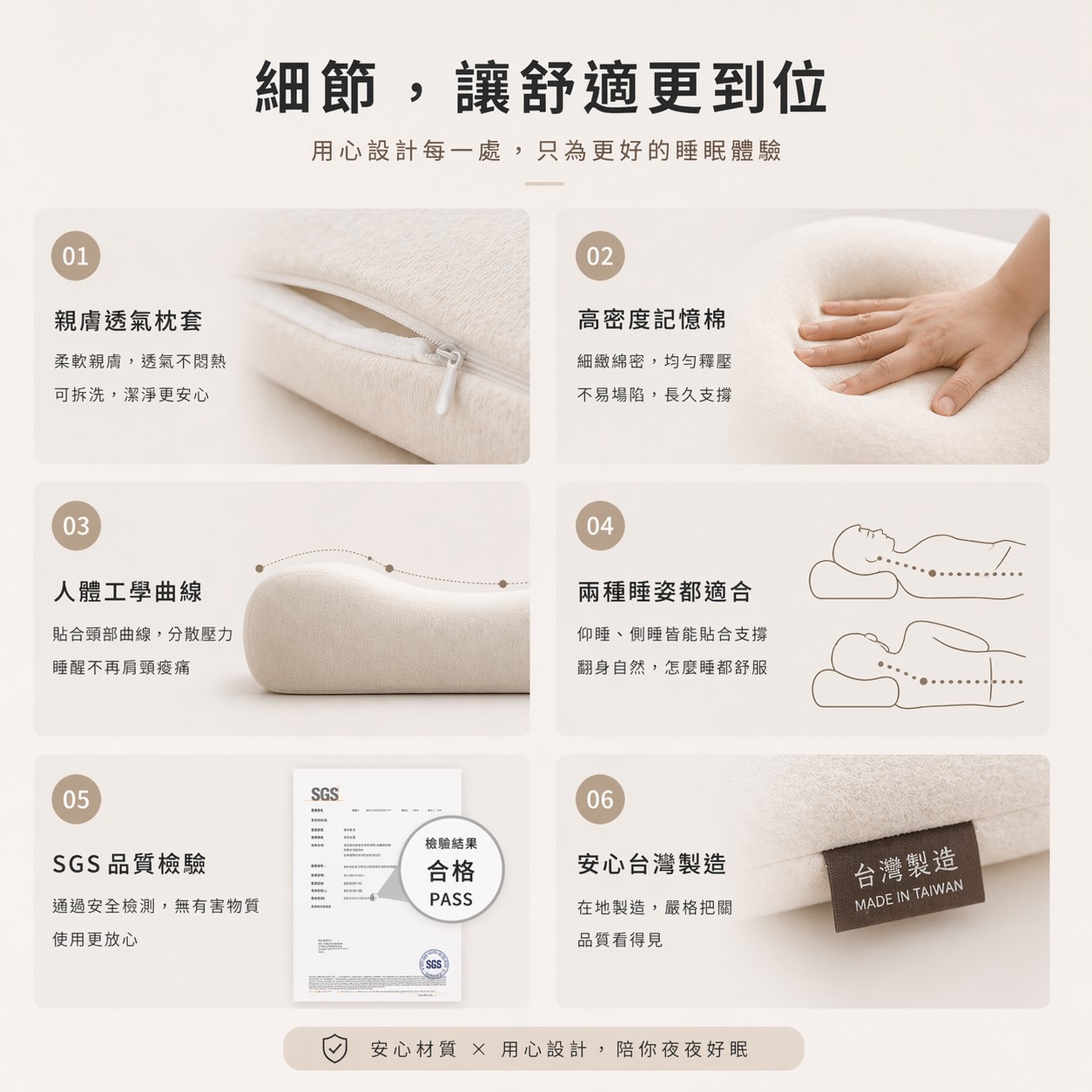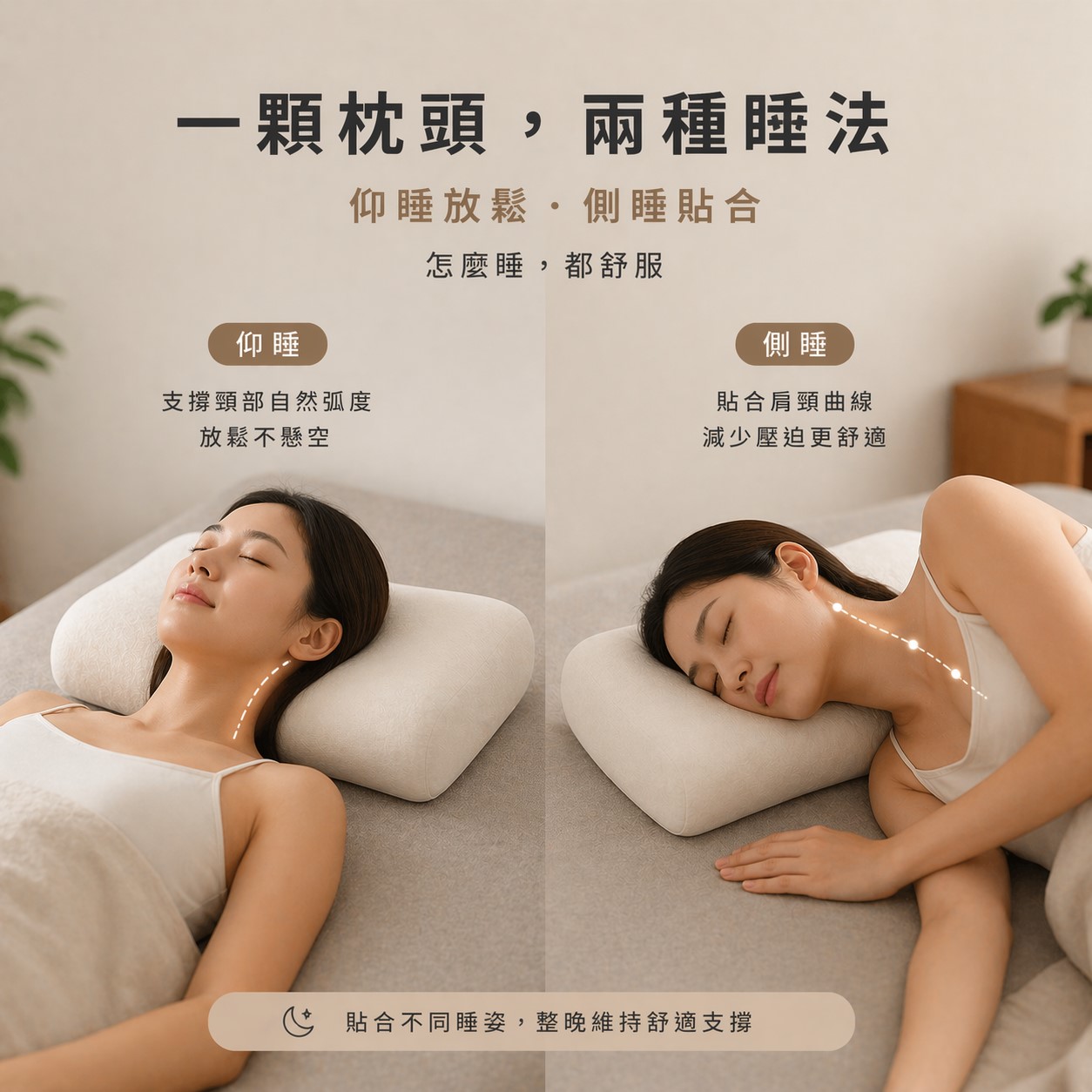 適合日常仰睡與側睡使用,依照不同睡姿調整枕頭位置,讓頭部與頸部維持自然曲線,幫助放鬆壓力、提升睡眠品質。